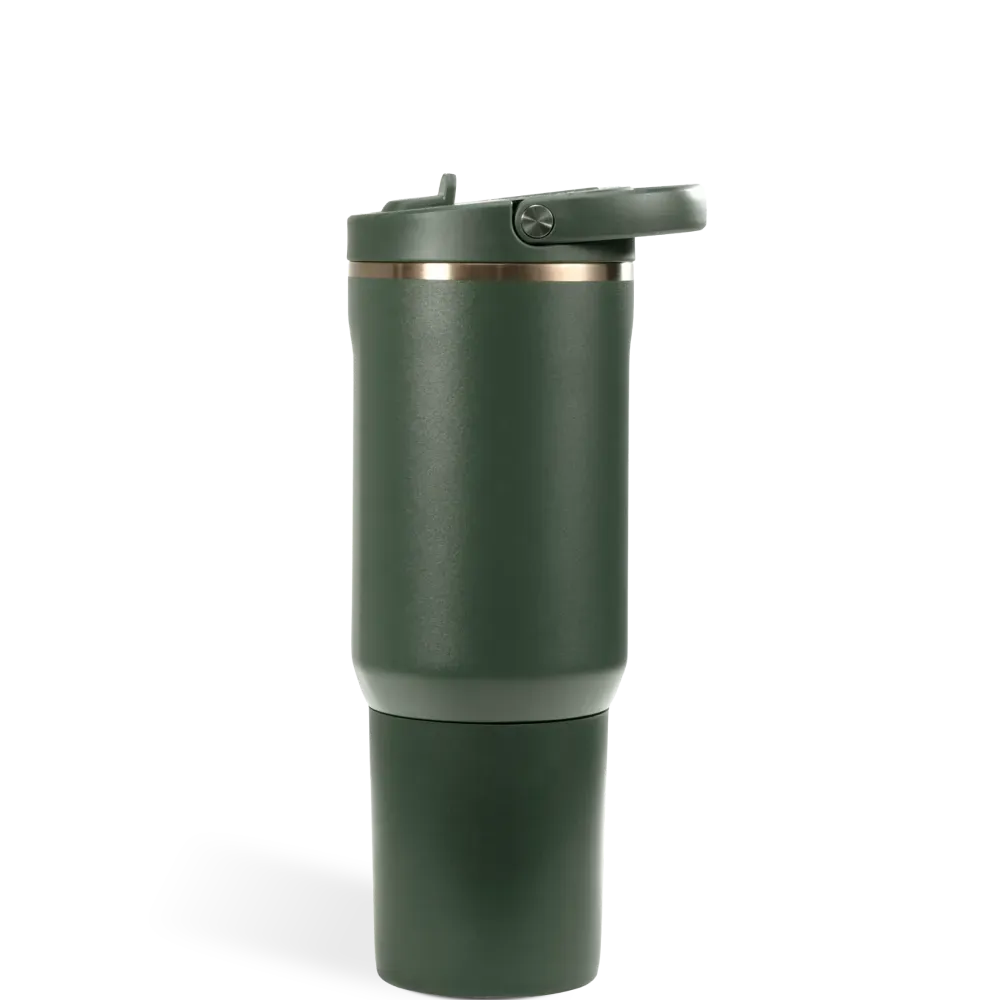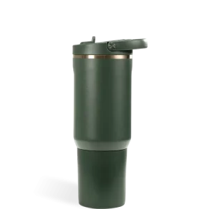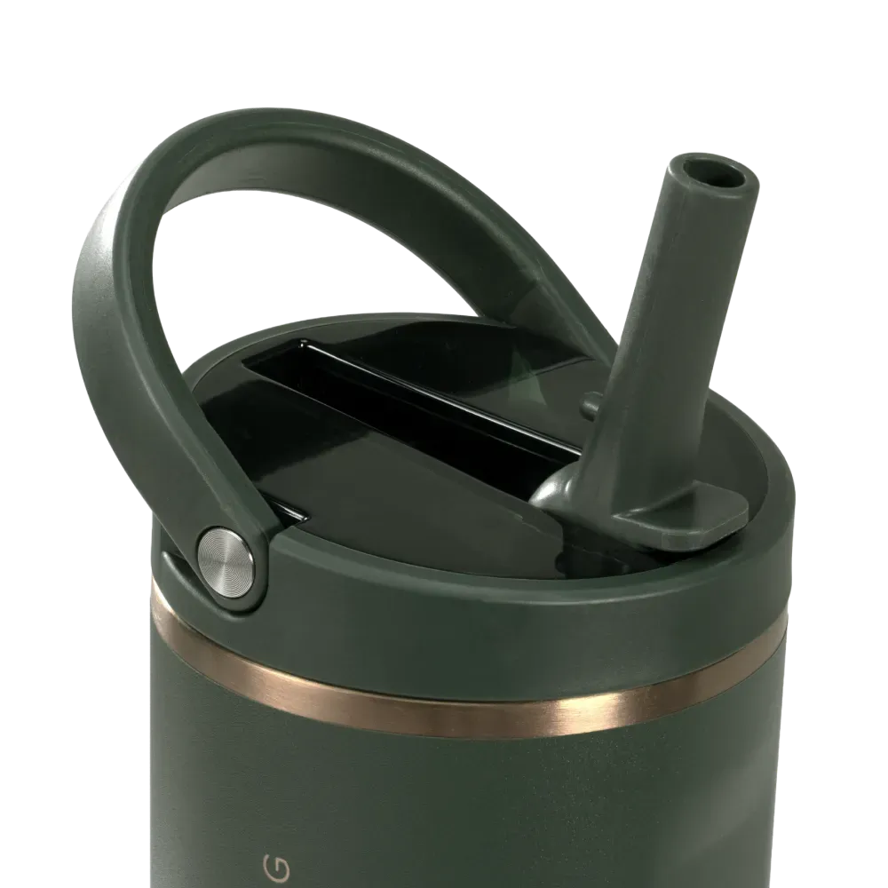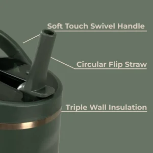 Fully leakproof with the straw down, this tumbler features a circular flip straw for quick sips, ergonomic side grips, and a bucket handle for comfortable transport. A protective rubber base adds durability, while the dishwasher-safe body makes cleaning effortless.