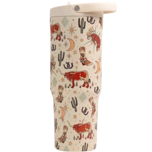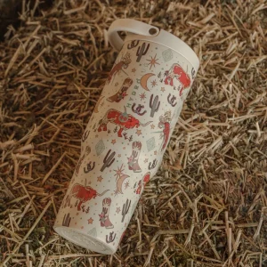 Designed for movement and performance, the HydroJug Sport 40oz in Rodeo combines durability with a bold western look. With its cream base decorated with longhorns, boots, cacti, stars, and moons, this insulated water bottle adds a rugged touch while delivering reliable hydration for workouts, commutes, or long days outdoors.